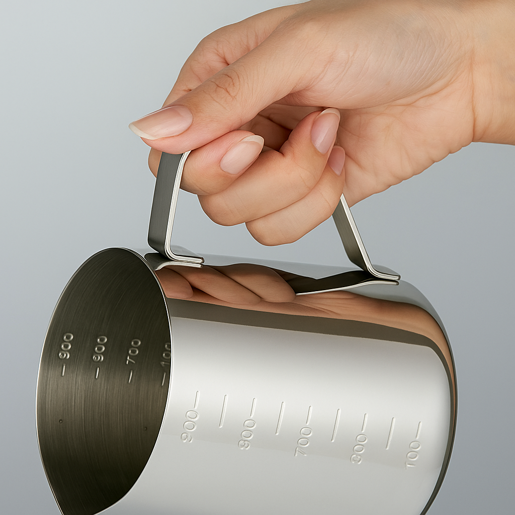 بيتشر حليب بسعة 900 مل مصنوع من الستانلس ستيل اللامع (Shiny)، تصميم أنيق بسطح عاكس مقاوم للصدأ، يد مريحة لسهولة الصب، ومخرج دقيق لتحكم مثالي في صب الحليب.