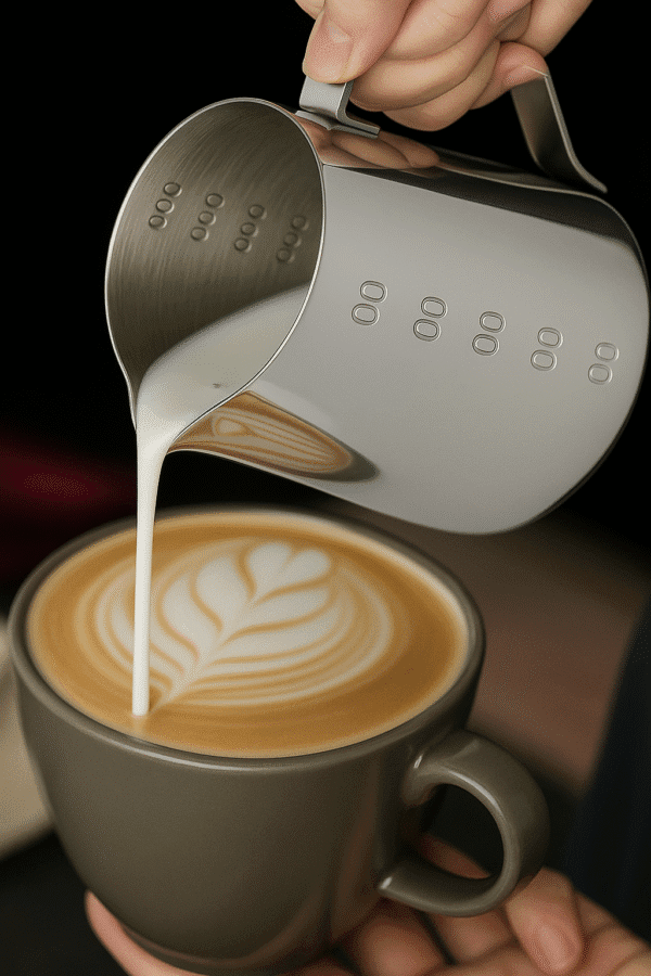 صب الحليب بدقة في أكواب اللاتيه والكابتشينو