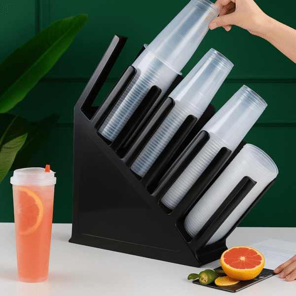يُستخدم لحفظ الأكواب الورقية بشكل مقلوب للحماية من الأتربة، مع تصميم يتيح سهولة الوصول إليها وسحبها بسرعة، ما يجعله مثاليًا لأماكن الخدمة السريعة مثل الكافيهات ومحلات الشاي ومكاتب العمل.