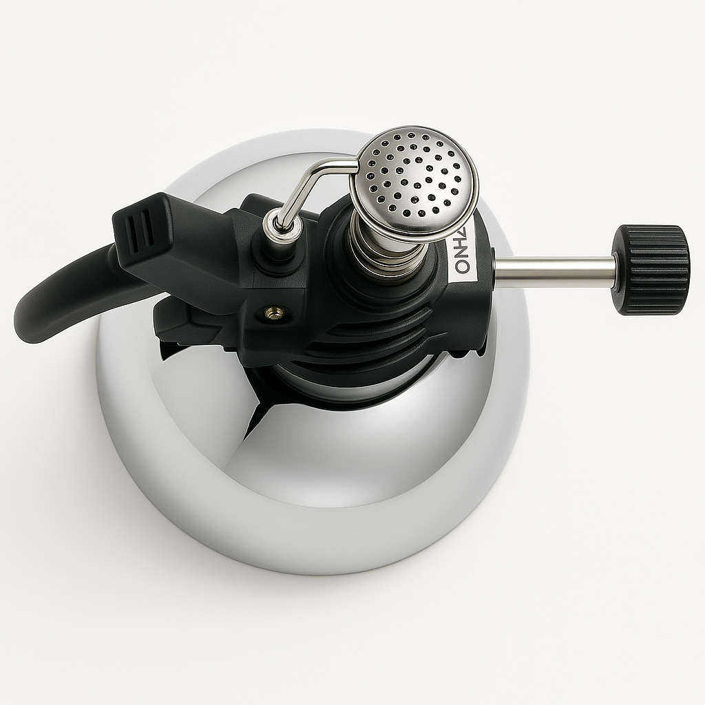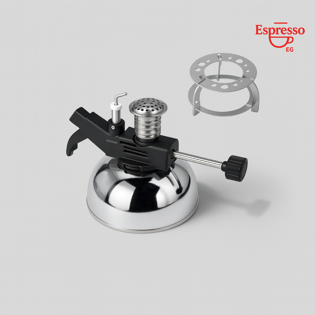 موقد غاز محمول عالي الجودة، مصنوع من الفولاذ المقاوم للصدأ مع لمسات نحاسية، مصمم لتوفير لهب مستقر وقوي. مثالي لتحضير القهوة المختصة واستخدامه كسبرتاية للتسخين المباشر.