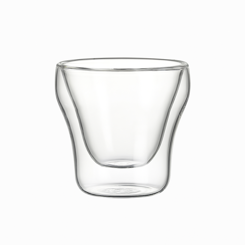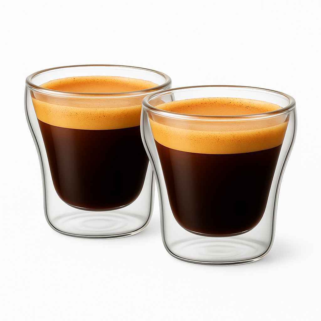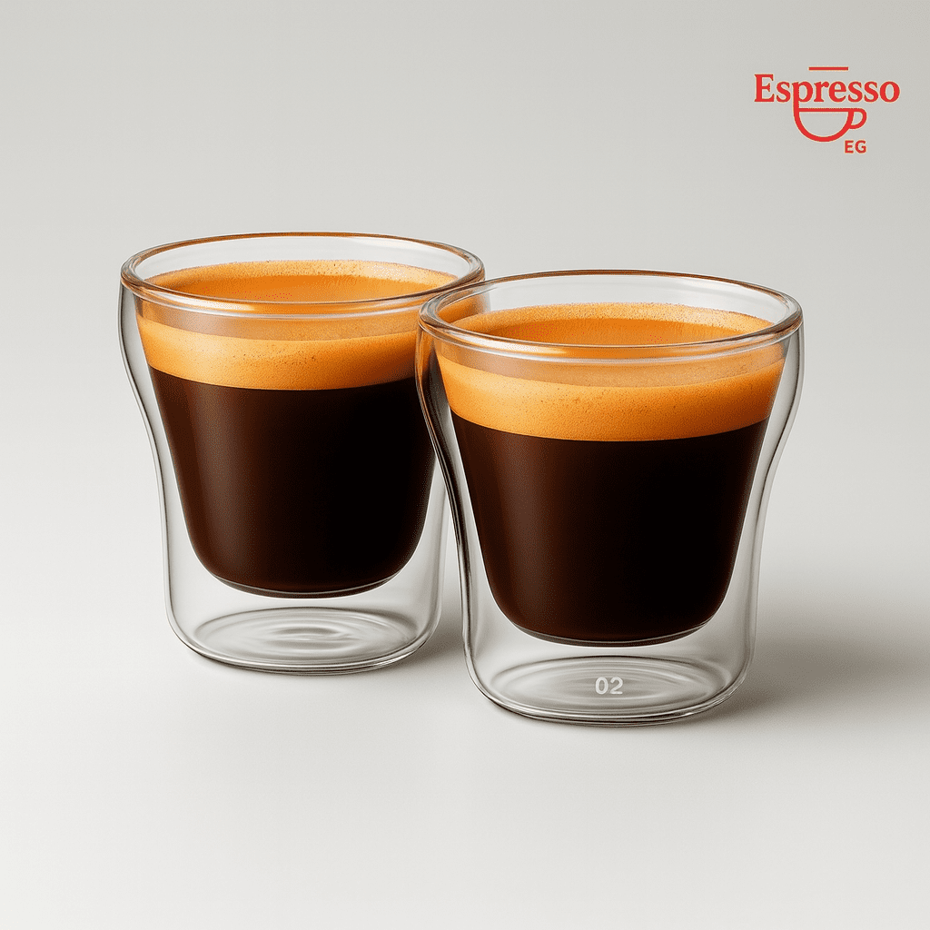 طقم دبل جلاس مستورد عالي الجودة بسعة 60 مل للكوب الواحد، مثالي لتقديم الإسبرسو دبل شوت. مصنوع من زجاج البورسليكات المقاوم للحرارة، بتصميم مزدوج الجدار يحافظ على حرارة المشروب دون انتقالها إلى اليد.