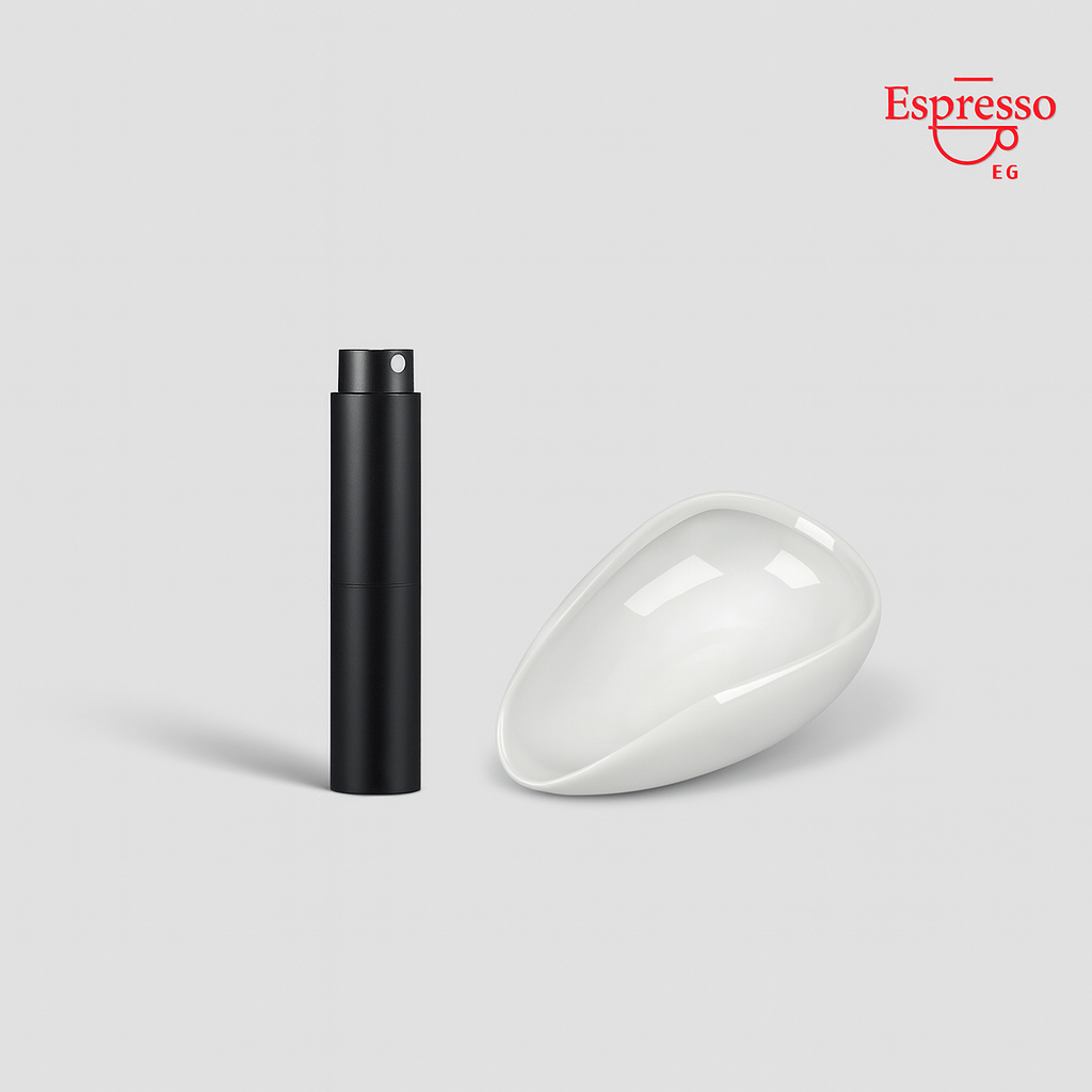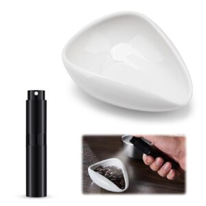 طقم تحضير الإسبريسو مكوّن من صحن سيراميكي على شكل ورقة + بخاخ صغير. يُستخدم لتحسين دقة وزن حبوب القهوة وتقليل الكهرباء الساكنة أثناء الطحن. التصميم أنيق باللون الأسود المطفي.