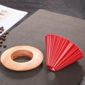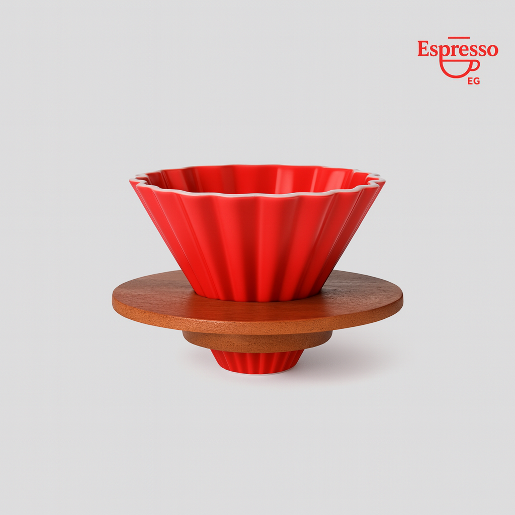 الجسم الرئيسي مصنوع من السيراميك الأحمر اللامع بتصميم متموّج يساعد على تحسين تدفق الماء، مع قاعدة خشبية طبيعية تُضيف لمسة جمالية ودعمًا ثابتًا للقطعة.