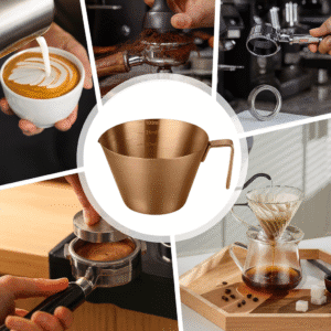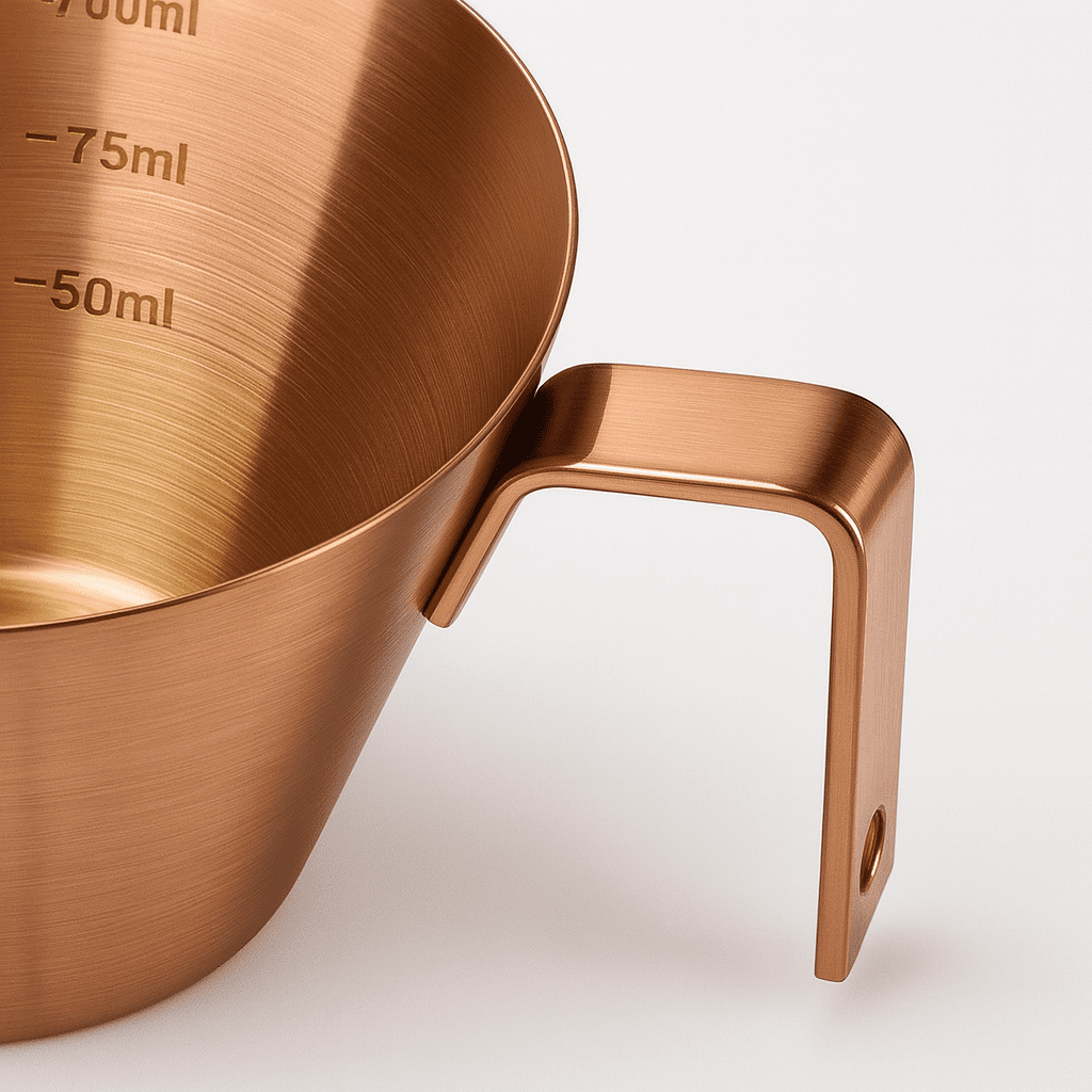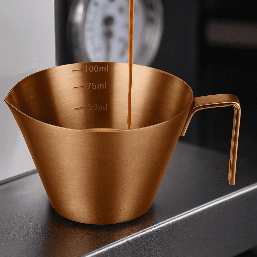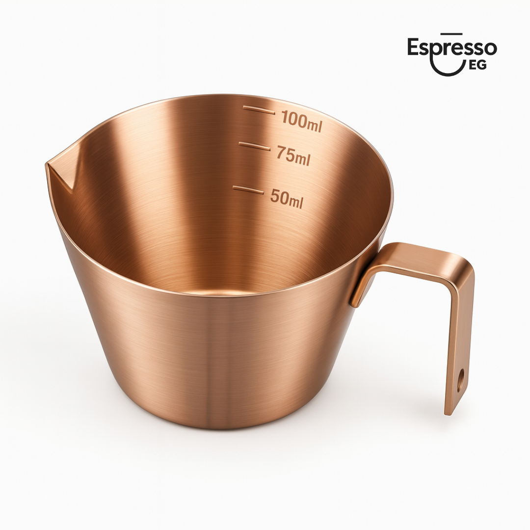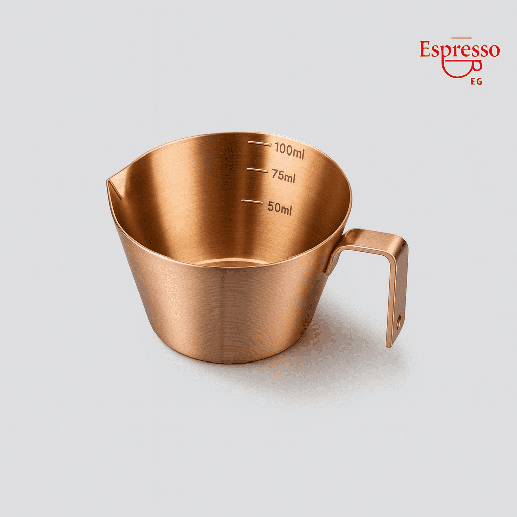 معيار مصنوع من ستانلس ستيل عالي الجودة لضمان المتانة وطول العمر، ومطلي باللون النحاسي الفخم اللي يضيف لمسة أنيقة لأي ركن قهوة. التصميم مخروطي مع تدريجات داخلية واضحة لحد 100 مل (50 – 75 – 100 مل)، وده بيساعدك تقيس السوائل بدقة متناهية. المقبض جانبي عملي ومتين، يسهل التحكم والصب بدون ما تسخن إيدك.